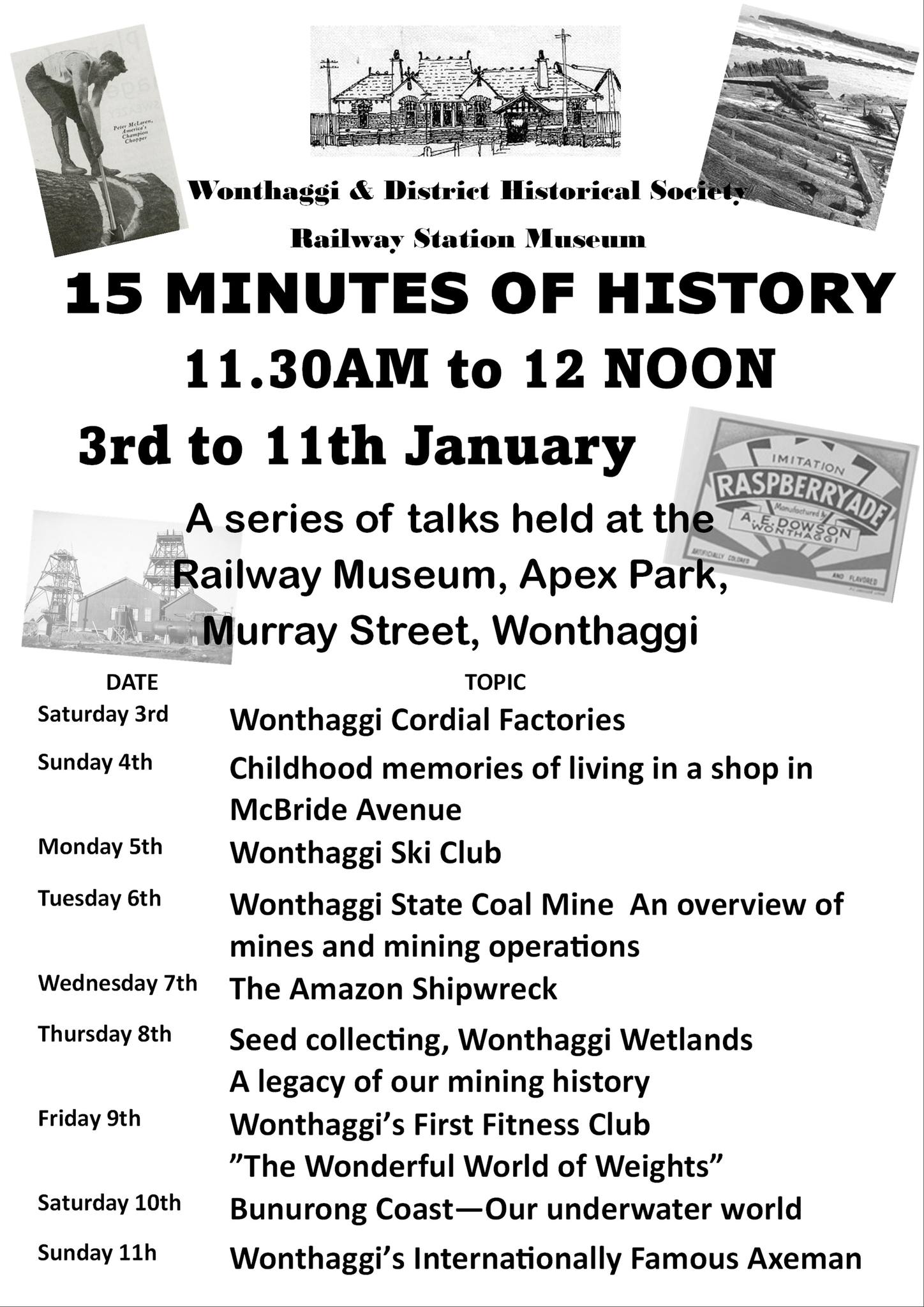 Wonthaggi and District Historical Society presents – 15 Minutes of History. A series of talks held at the Railway Museum, Apex Park, Murray Street, Wonthaggi. Time: 11.30am to 12 noon, January 3rd to January 11th, 2026. Free, All welcome.
