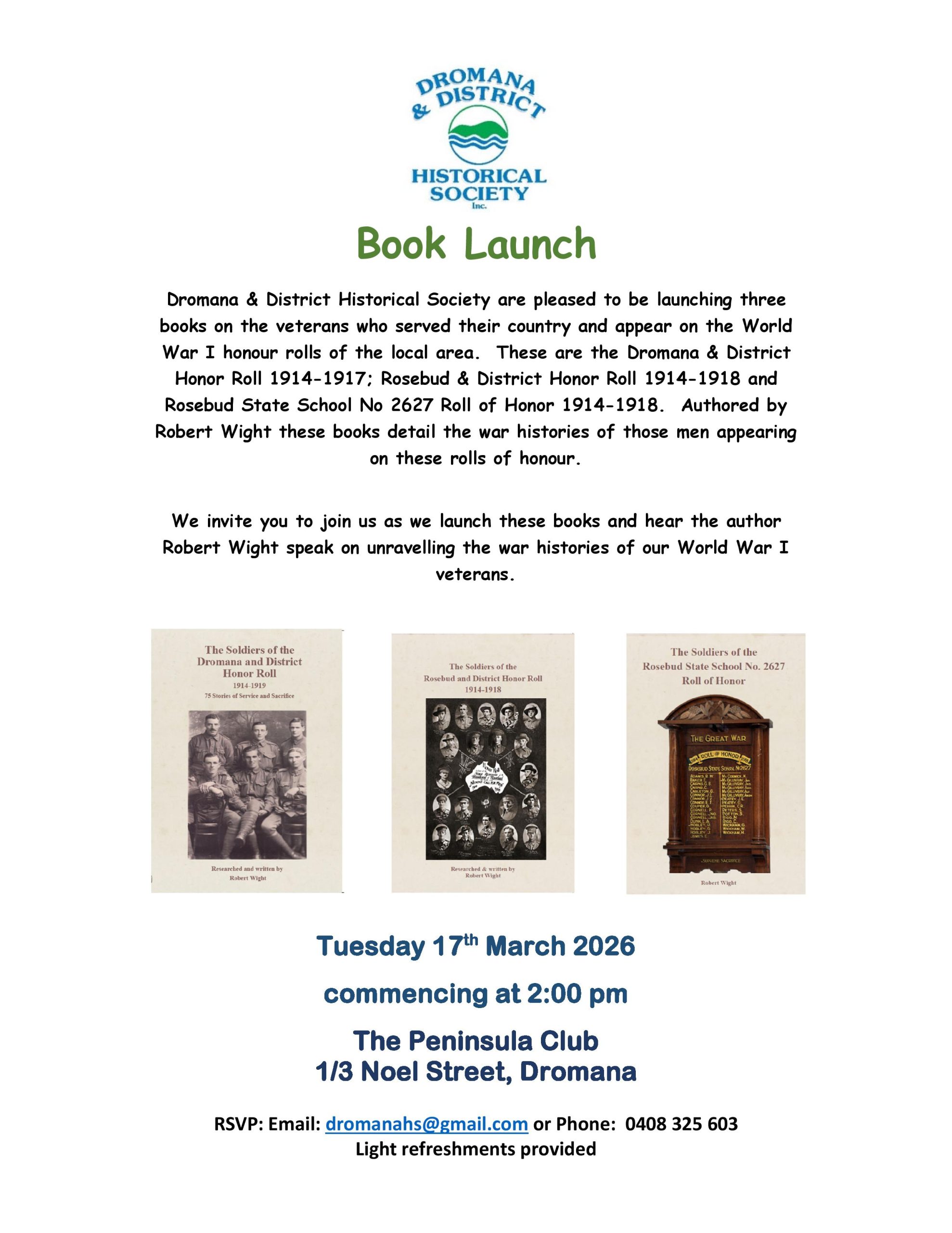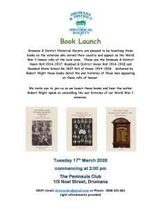 Dromana & District Historical Society invite you to the launch of three books on the veterans who served their country and appear on the World War I honour rolls of the local area. These are the Dromana & District Honor Roll 1914-1917; Rosebud & District Honor Roll 1914-1918 and Rosebud State School No 2627 Roll of Honor 1914-1918. Authored by Robert Wight these books detail the war histories of those men appearing on these rolls of honour.