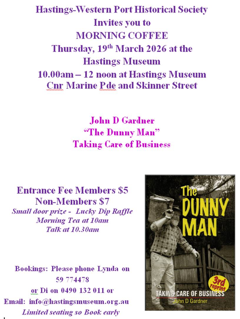 Hastings Western-Port Historical Society invite you to their morning coffee. Guest speaker is John Gardner, the author of The Dunny Man: taking care of business.