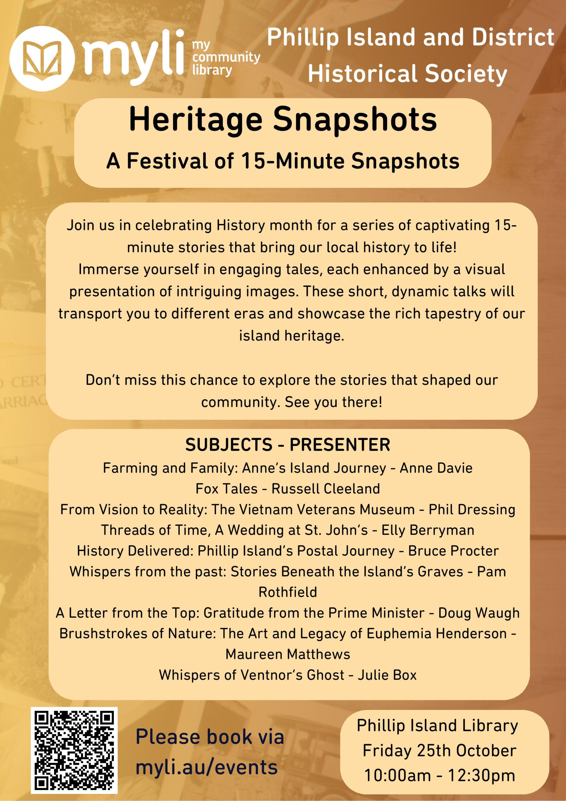 When: Friday, October 25, 2024 10:00am – 12:30pm. Where: Phillip Island Library. Free, but Bookings essential https://www.eventbrite.com.au/e/heritage-snapshots-phillip-island-library-tickets-1027607440517
